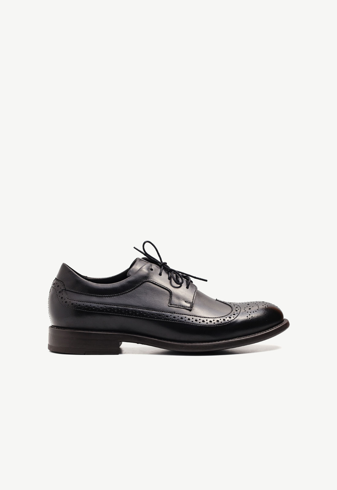 Класичні броги з чорної шкіри Кабір. Створені на зручній колодці з круглим носиком. Гумова підошва всередині має вставку з матеріалу EVA. Завдяки цьому наші класичні конструкції є ще комфортнішими.