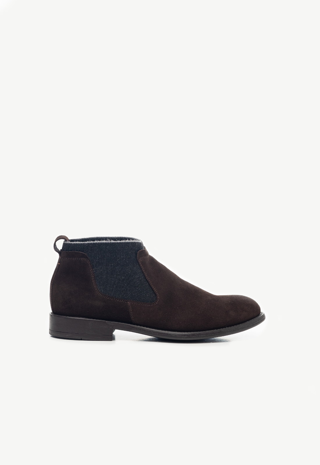 Челсі з шерстяною гумкою виконані з коричневої замшевої шкіри. Перевірена зручна колодка та гумова підошва з амортизуючою вставкою з матеріалу EVA забезпечують комфорт при ходьбі. Черевики утеплені шерстяною байкою. Гумка в челсі також в складі має шерсть та побудована в спосіб шкарпетки. Одночасно і класична, і повсякденна модель взуття на осінь те теплу зиму.