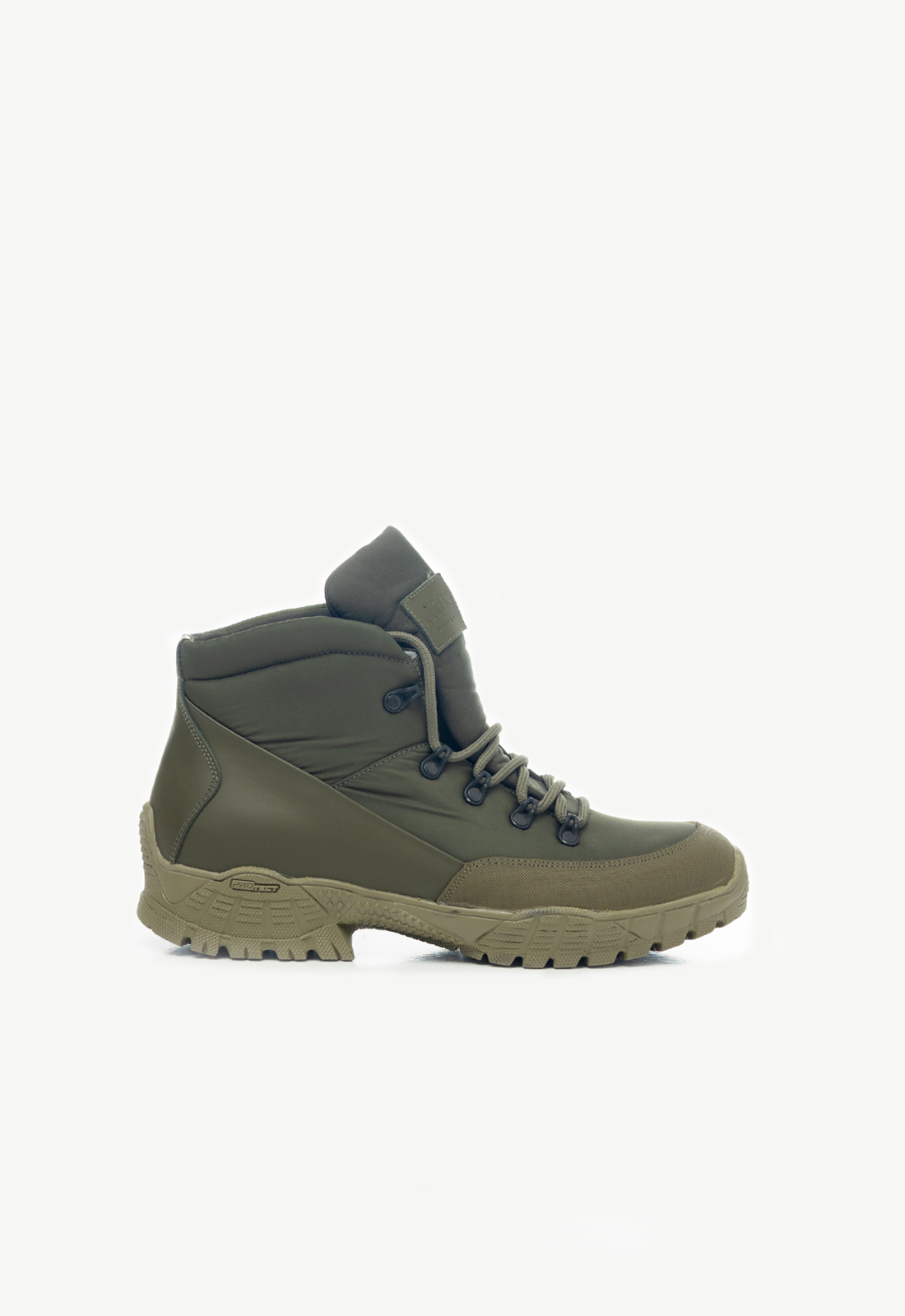 Водонепроникні черевики з мембраною всередині. Мікропориста мембрана Windtex VTF50 з дуже високою водонепроникністю, міцною зовнішньою поверхнею та захисним внутрішнім шаром. Шви мембрани заклеються на спеціальному обладнанні, яке ми використовуємо на нашому виробництві для створення тактичного взуття для військових. Заклеювання швів гарантує повну ізоляцію води. А якість та щільність мембрани забезпечить комфот та тепло при низьких зимових температурах. Модель також має підошву з міцним протектором, виконану з матеріалу термоеластопласт. Верх черевиків створений з міцної та щільної плащової тканини та прогумованої шкіри.