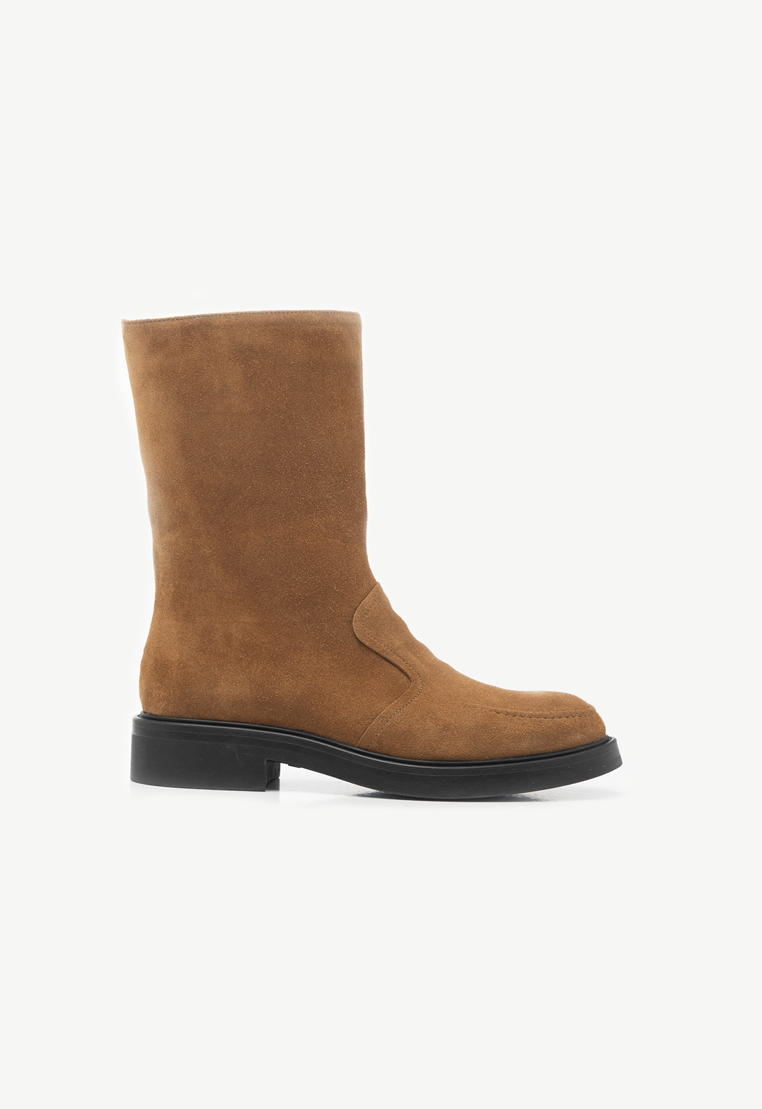 Утеплені черевики середньої висоти на гумовій підошві. Виконані у світлій замші. Підошва для взуття створюється на італійській сімейній фабриці, в складі має гуму та вставку з матеріалу EVA. Цей матеріал додає тепло та амортизацію при ходьбі, а технологія називається "подвійна пружина". Висота черевиків — 26,5 см. Охват у верхній точці — 34 см. Всередині — шерстяна байка. Ідеальна для осінньо-зимового сезону.