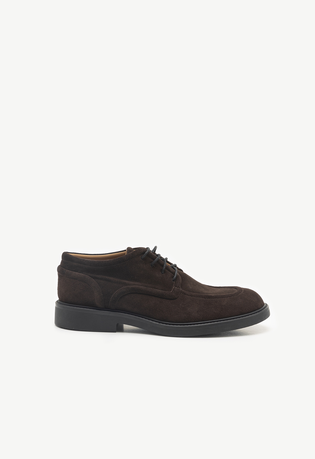Класичні дербі з утепленою підошвою з мʼякої замші глибокого коричневого кольору. Пара виконана на підошві лінійки Gum Touch, яка в складі має гуму, а всередині – амортизуючу вставку з матеріалу EVA. Такий склад підошви захищає стопу від стресів та забезпечує постійний комфорт.